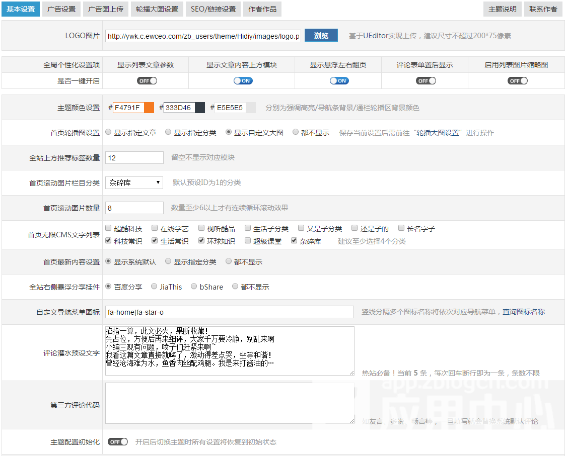 主题配置:颜色点击选择(内置色板)、分类点击选择(无需填ID)、广告图直接上传(无需FTP),免去各种累!