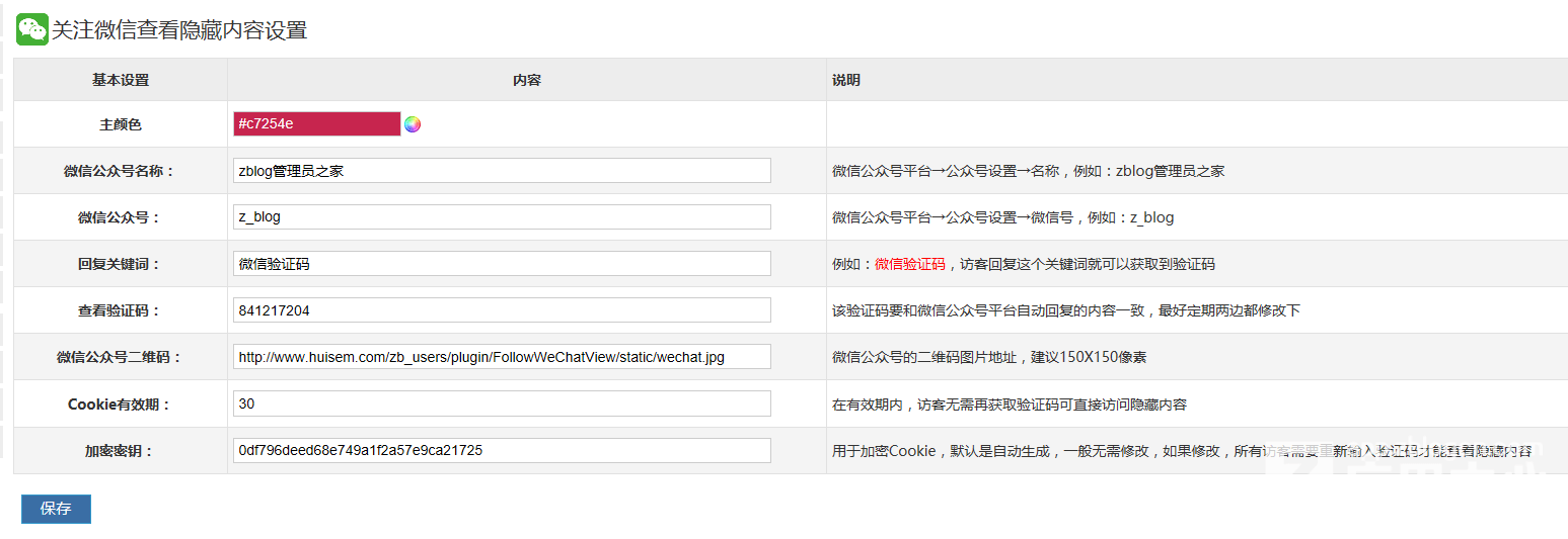 该插件可以隐藏zblog文章中的部分内容,当访客关注博主的微信公众号后,回复指定关键词来获取验证码,在文章页面输入正确的验证码即可查看被隐藏的内容。