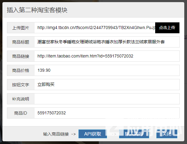 (3)点击API获取,自动获取内容到相应的地方。商品id和其他已经获取到的信息请不要随意修改。