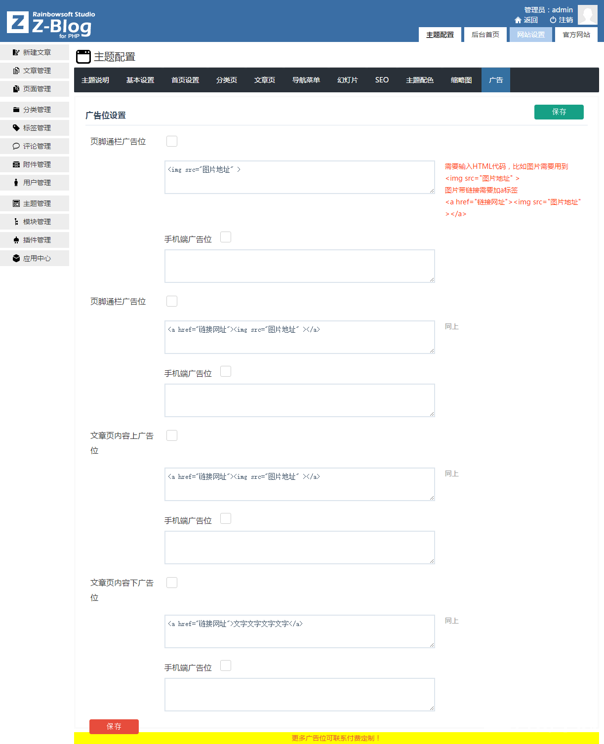 支持4个广告位,文章内容区广告位,支持PC与手机端分离,分别设置!