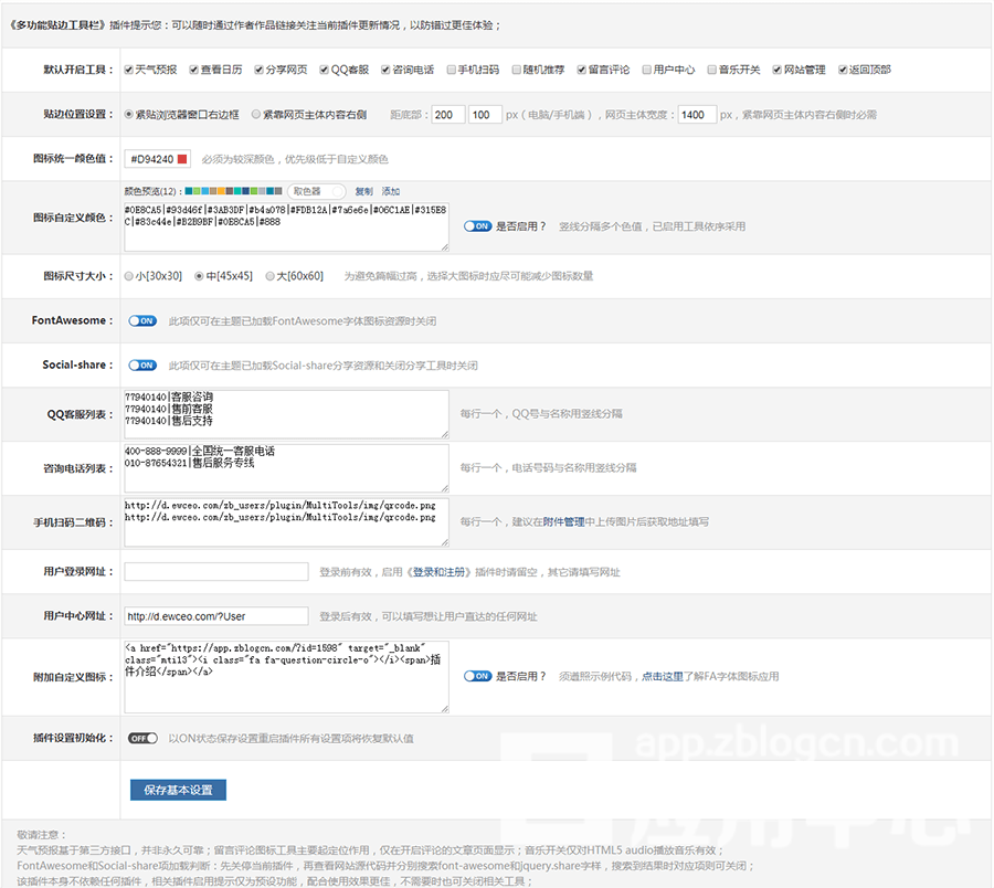 智能悬浮网页右侧,目前有天气预报、查看日历、分享网页、QQ客服、客服电话、手机二维码、随机文章、评论定位、用户登录、音乐开关、返回顶部、网站管理信息等12个预置工具,还能自定义添加任意工具图标。