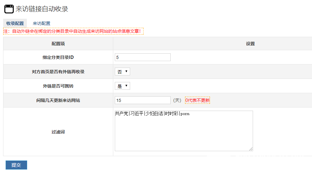 2.新增“关键词过滤”,可自行设置来访网站是否含有违禁词而不收录;
