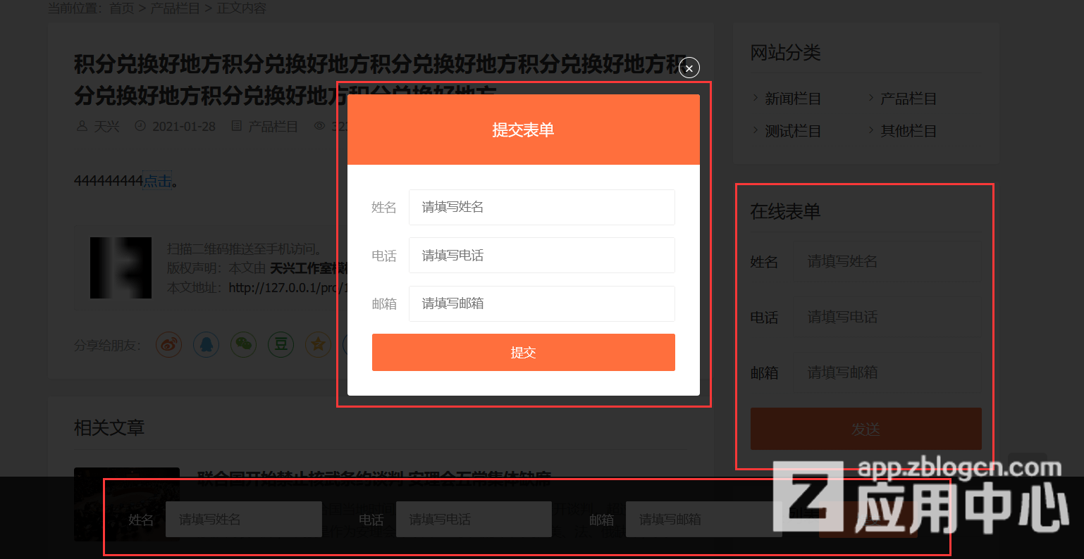 这是一款天兴工作室开发的zblog在线表单插件。开启插件后会在网站前台插入一个表单,有五种显示和调用方式: