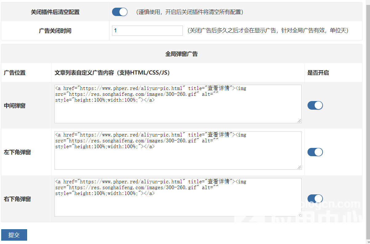 插件只是简单的实现左下角、右下角、居中位置的弹窗广告位,可以直接用来当做广告位也行,站点公告也行,同时插件采用cookie来记录关闭时间,实现关闭弹窗后多久时间内不在重复弹窗,详细看图(以实际界面为主):