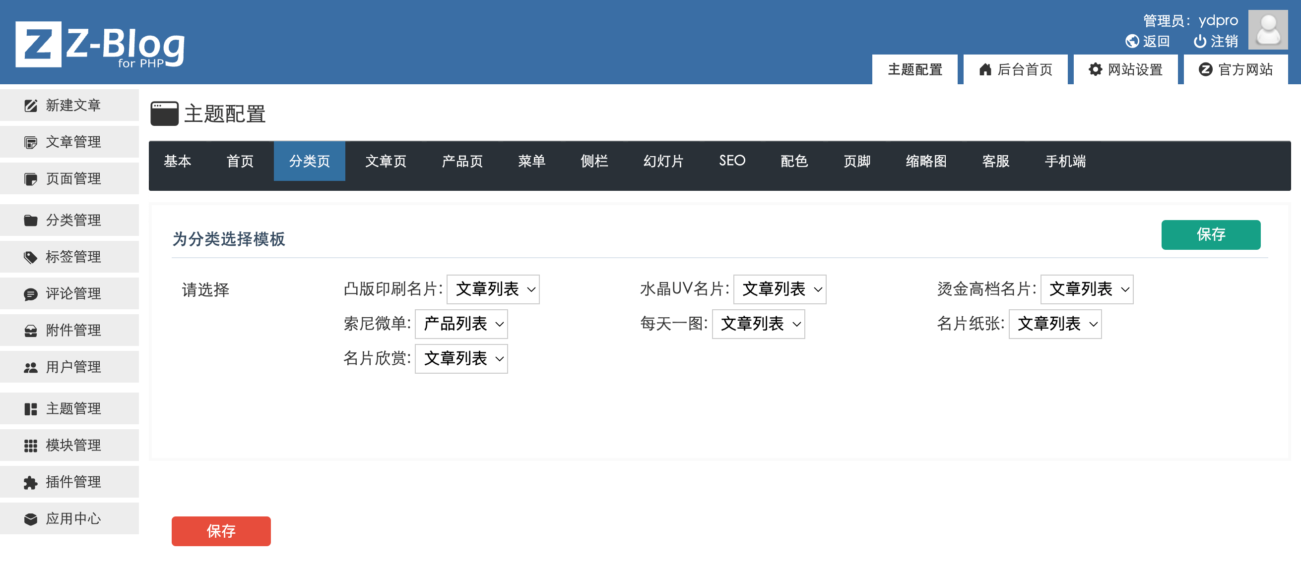 3、分类样式:在主题配置内,可以直接为所有分类选择模板,内置了普通文章列表和商品展示样式