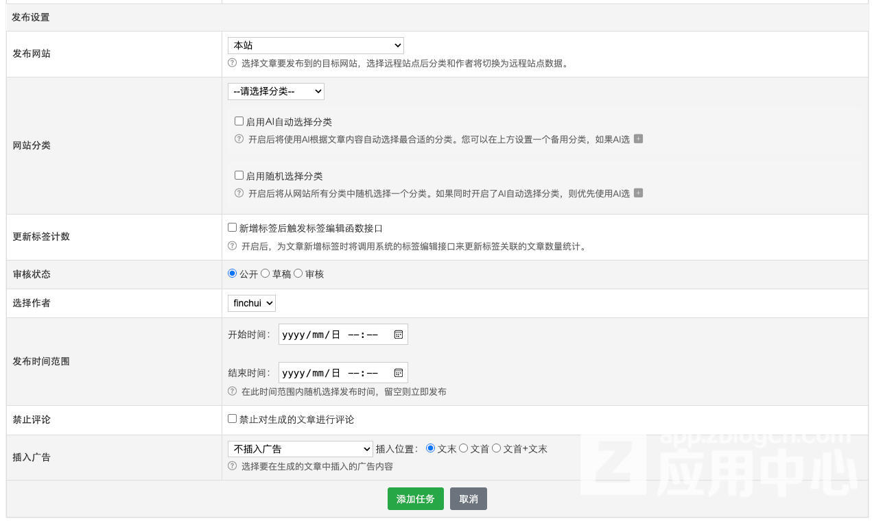 支持批量添加创作任务,不同批次的任务可以设置不同的AI大模型。自动化生成文章内容时,可同步设置文章分类、作者、审核状态、发布时间等参数,其中发布时间支持设定范围并随机分配,更适合真实运营节奏。