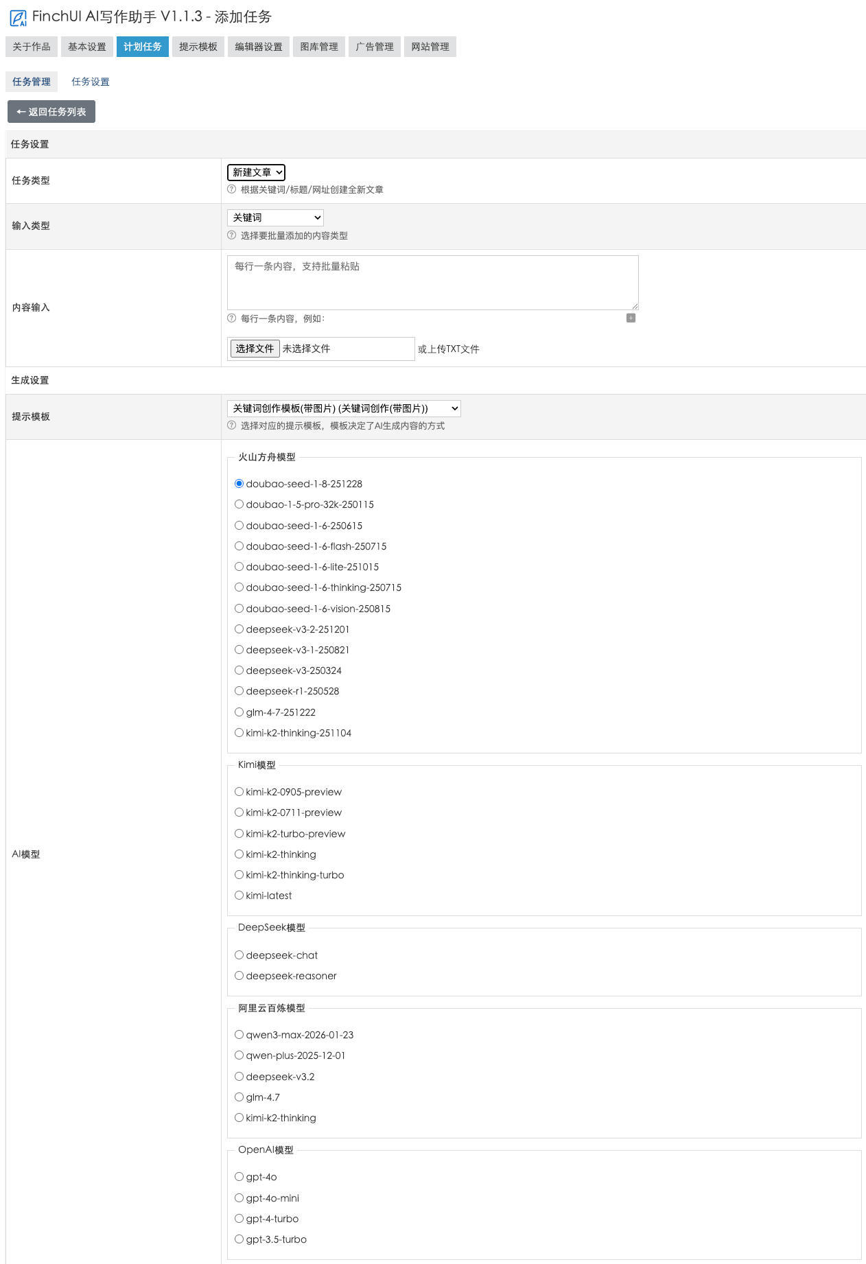 FinchUI AI写作助手 DeepSeek 豆包 Kimi 千问 智谱 ChatGPT 批量生成文章 智能配图 重写文章 定时发布 多网站群发