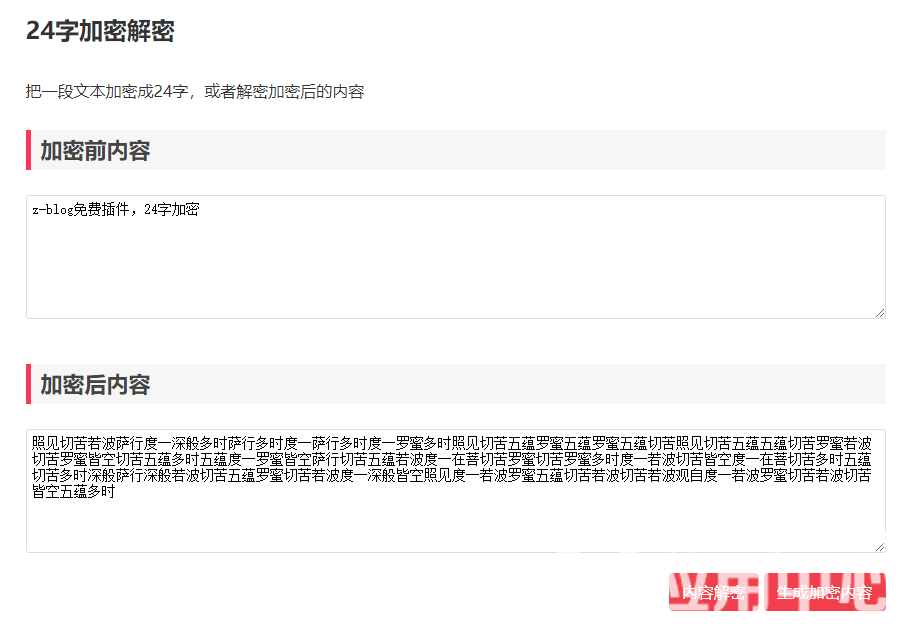 把一段文本转换为24字,或者解密转换后的24字,很有意思的文本处理方式。 后台可以设置加密文字内容。