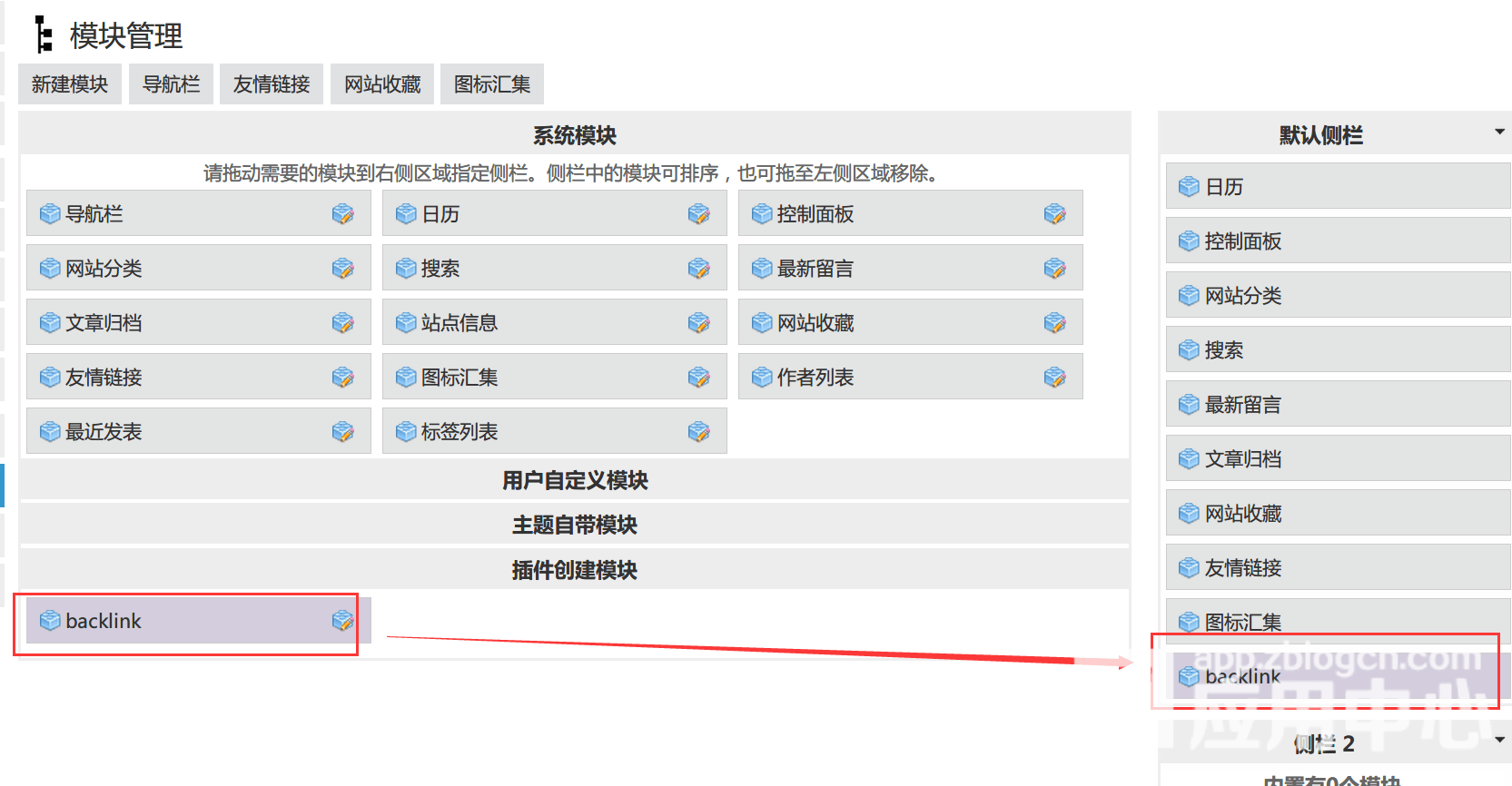 5、进入博客后台导航的模块管理,把 【backlink】 这个模块拖入右侧你的侧栏模块中