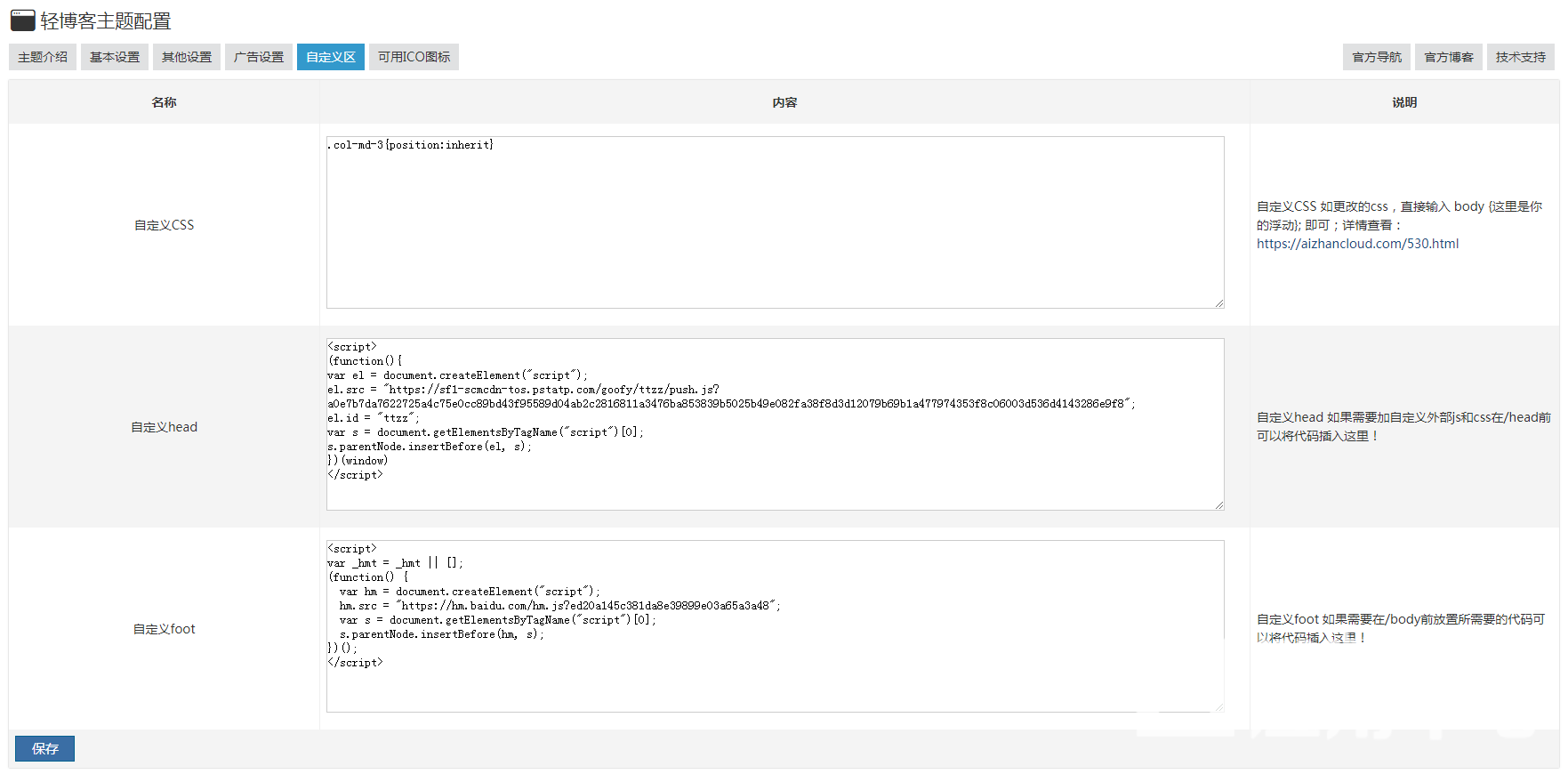 后台设置(前台样式请看上面的主题演示吧,下方截图是轻博客主题配置截图,截图来自演示站的,可用图标为bootstrap的图标,太多了就不截图了,喜欢的小伙伴就赶快下单吧!)