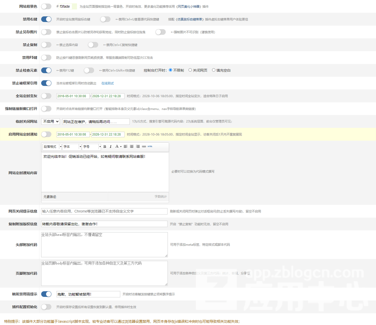 该插件目前有 禁止右键/选择(复制)/F5/F12键、禁止另存图片、强制链接新窗口打开、统一设置网站背景色、网站禁止被框架引用、网页定时变灰、临时关闭网站、定时通知公告、网页关闭提醒、代码压缩、头部/页脚添加代码等至少15 项功能。