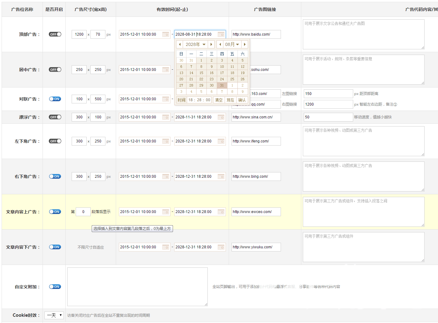 目前有:顶部、底部、飘浮、左/右对联、左/右下角、居中、文章内容上/下方及自定义附加等至少10种广告位;